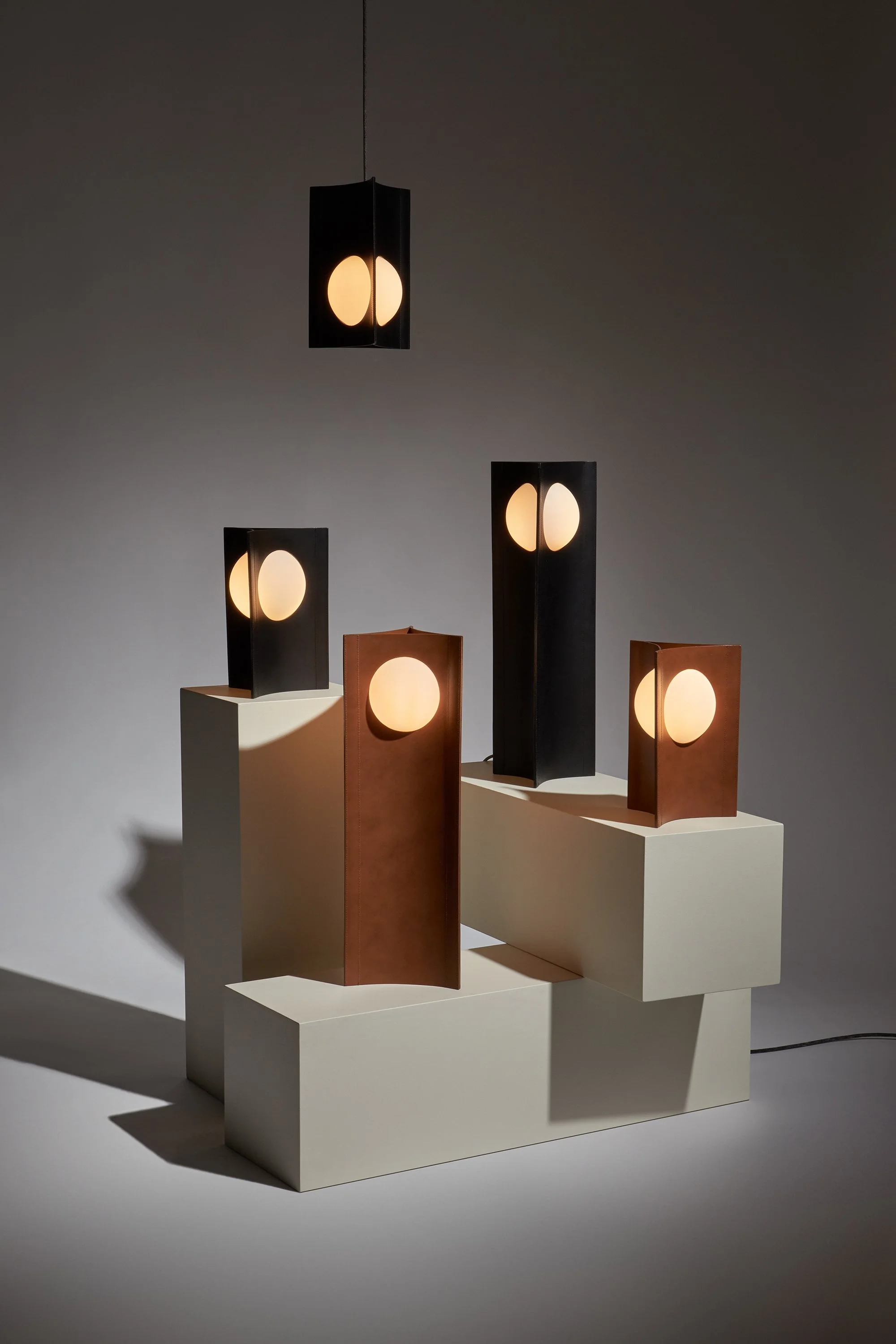 A unique collaboration between Studio Aristotelis Barakos and Aumorfia, the Hecate lighting collection unveils a captivating blend of modern elegance and ancient mysticism. A tabletop lamp, a floor lamp, and a pendant lamp are meticulously handcrafted from pieces of sumptuous leather, stitched along the edges to form a modern interpretation of a tripod with a radiant sphere suspended within.