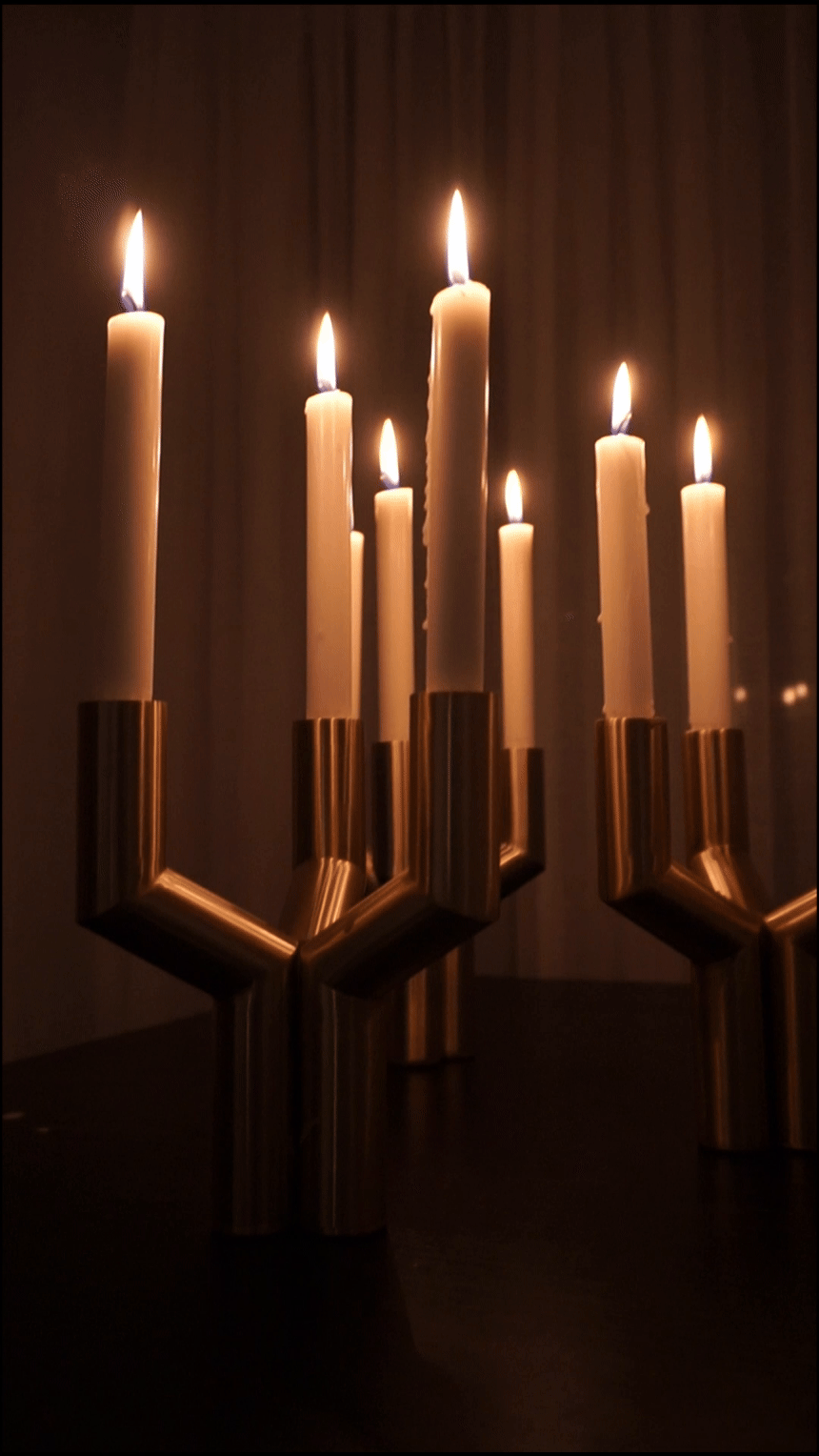 The solid metal candle holder has been envisioned as an austere ritual artefact, a quality that lends it its name. It consists of three identical parts of welded brass tubes connected at their base, with each tube able to hold one candle. Its strict form and choice of material is a reference to the Brutalist architectural movement of the 1950s.
