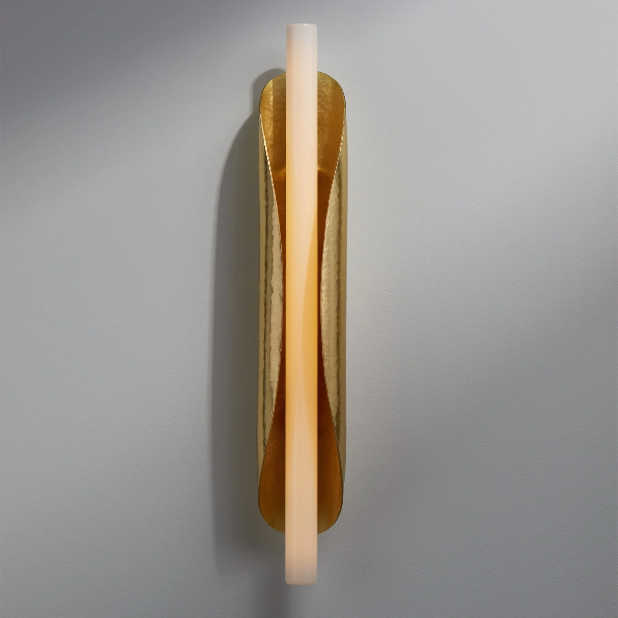 Taco de Luz is made with an oval sheet of hammered metal that gently embraces and partially conceals the tubular lamp within — hence its fanciful name. The soft curvature of the rolled metal both conceals and accents the light source, resulting in a wall fixture that is interesting even when it’s not lit.