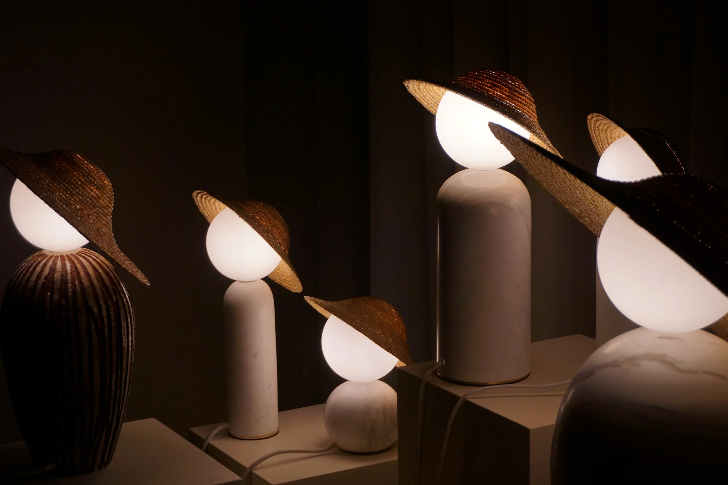 The base is made of white Volakas marble from Drama, Greece, with its characteristic grey veins. Because of the natural patterns in the marble, every lamp is unique. The head of the lamp is an opaque glass sphere that contains an LED bulb emanating a smooth, warm light. The straw hat lampshade is made by hand in Athens, Greece, and can move to any direction to provide different lighting effects. A brass disc seals the base of the lamp and bears the designer's logo.